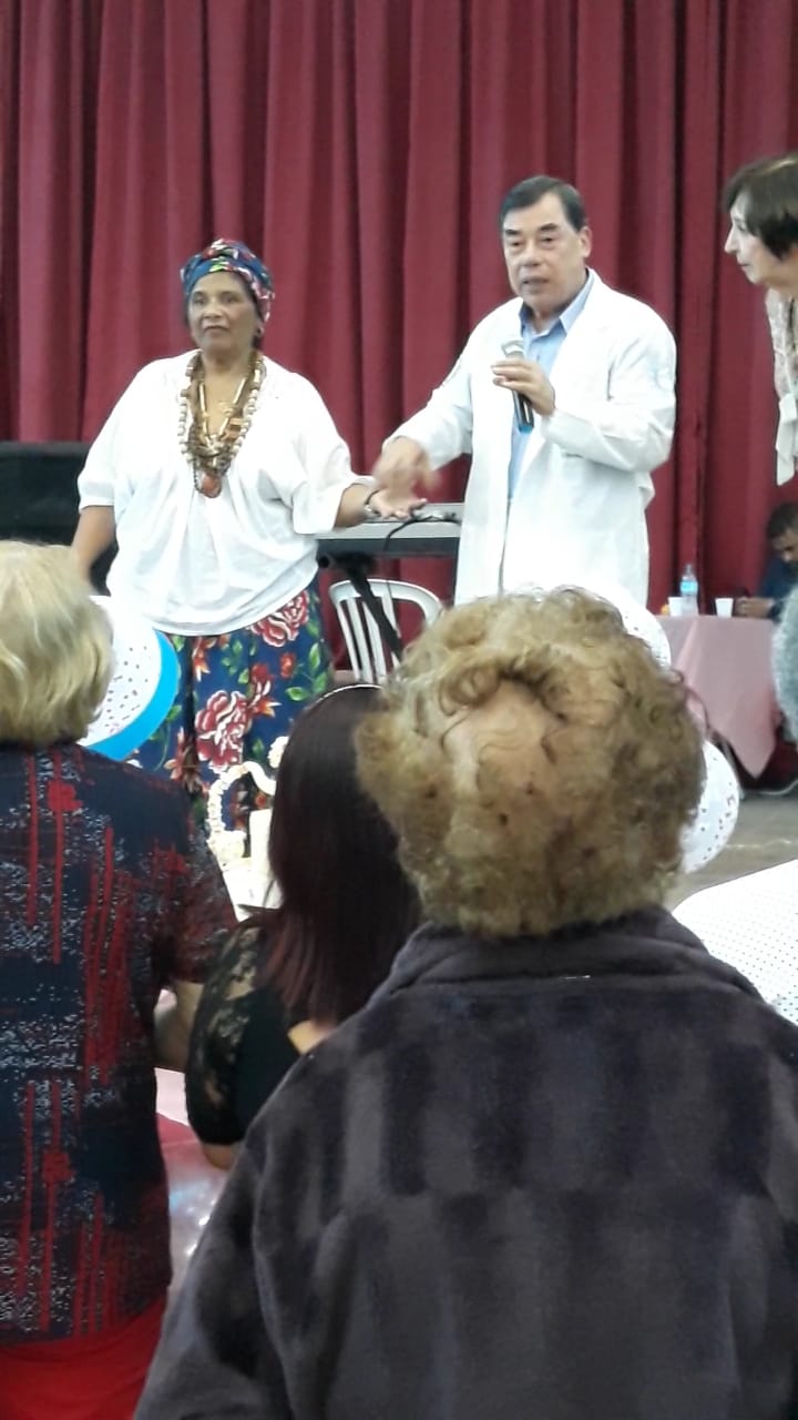 De uma forma descontraída o Dr Yip Fu Kwan, fundador e Diretor Executivo da AZYMEC, falou aos associados sobre os primeiros socorros através da acupressão nos casos de desmaio, taquicardia, hipertensão e sufoco devido a pigarro preso na garganta. Os associados participaram com muita animação e espontaneamente, alguns voluntários simularam as situações emergenciais para serem atendidos.